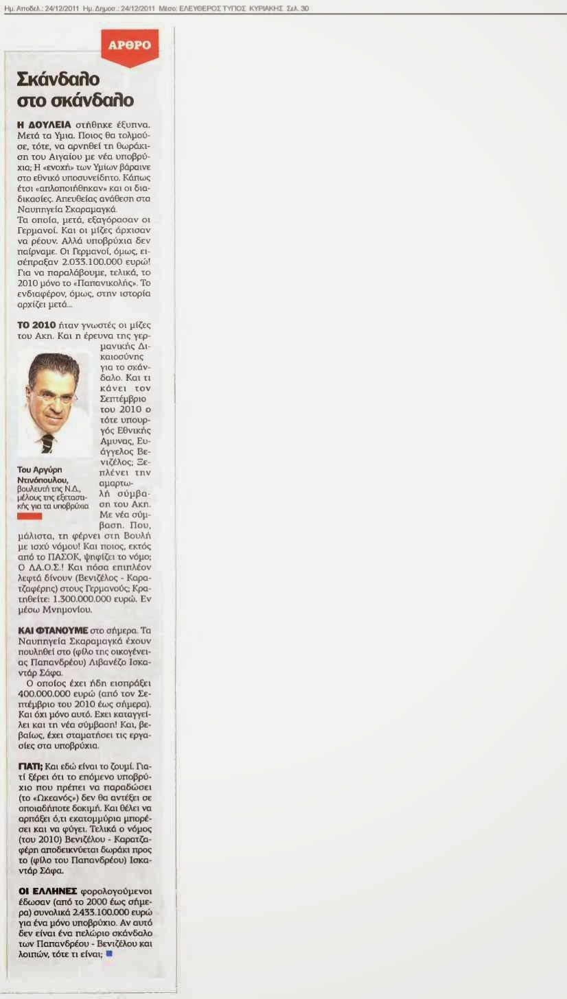εισπράξει ( κρατηθείτε) 2.433.100.000 ευρώ και κατάφεραν ( με τις μίζες που μοίρασαν) να έχουν παραδώσει όχι επτά, αλλά ΜΟΝΟΝ ΕΝΑ ΥΠΟΒΡΥΧΙΟ.Μπορείτε να διαβάσετε ένα αποκαλυπτικό ρεπορτάζ του Θανάση Αργυράκη στον σημερινό ( 24-12-11) Ελεύθερο Τύπο και ένα σχετικό άρθρο του βουλευτή Αργύρη Ντινόπουλου ( το άρθρο το επισυνάπτουμε σε αρχείο jpg )