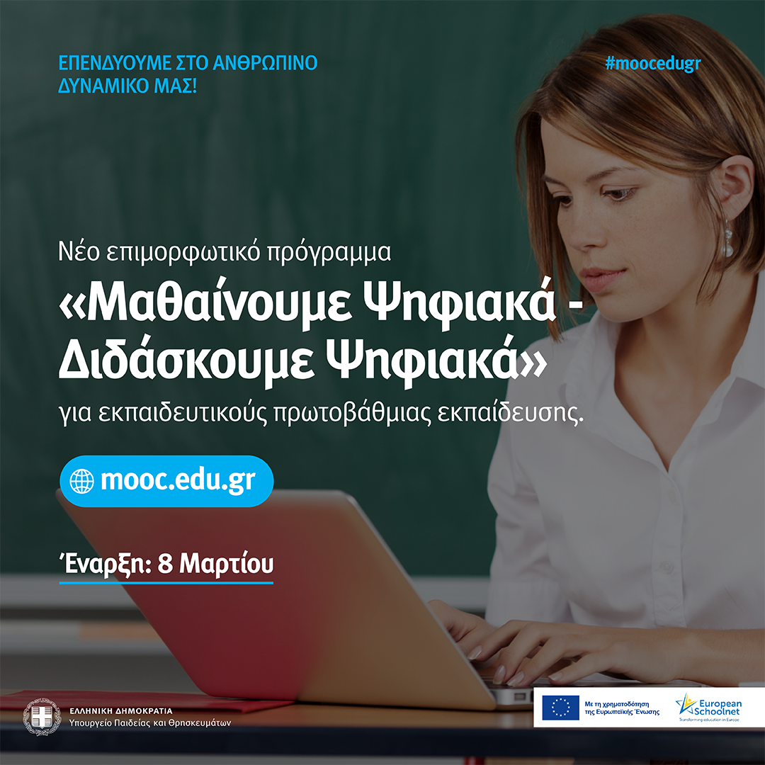 Στις 8 Μαρτίου ξεκινάει το νέο επιμορφωτικό πρόγραμμα «Μαθαίνουμε Ψηφιακά-Διδάσκουμε Ψηφιακά», που απευθύνεται σε εκπαιδευτικούς της πρωτοβάθμιας εκπαίδευσης, σε συνέχεια του επιτυχημένου προγράμματος για τη δευτεροβάθμια εκπαίδευση, που ολοκληρώθηκε τον Δεκέμβριο.